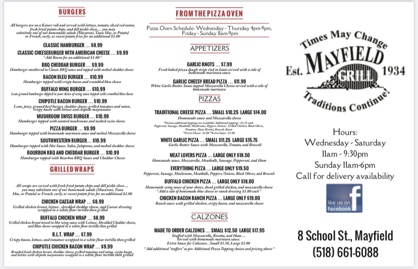 Welcome to Mayfield Grill, a hidden gem located in the heart of Mayfield, NY, where the warmth of a cozy atmosphere meets an enticing menu. At this local favorite, you can indulge in a range of delicious offerings, from their French Onion Soup at just $7.00 to mouthwatering Chicken Quesadillas and a variety of toasted hoagies, including the savory Philly Steak Hoagie.